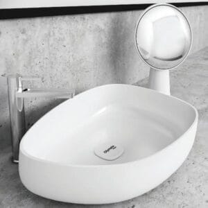 Metamorfosis 42550 – Ασύμμετρος μοντέρνος επιτραπέζιος νιπτήρας μπάνιου από τον Ιταλικό οίκο Olympia. Ένας άσπρος γυαλιστερός κομψός νιπτήρας μπάνιου από πορσελάνη σχεδιασμένος για να εντυπωσιάσει με το καινοτόμο σχεδιασμό. Επιπρόσθετα μπορεί να συνοδευτεί με πορσελάνινη βαλβίδα.
